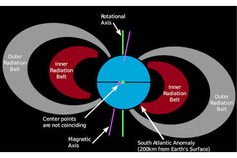 The SAA (also known as the South Atlantic Magnetic Anomaly, or SAMA) is thought to have developed above Southern Africa within the past millennium and begun spreading west across the South Atlantic Ocean in the centuries since. According to current modeling, this weak area reached eastern South America in the 19^th century and has continued to grow. It now extends from the Pacific Ocean off the Chilean coast across South America and the Atlantic Ocean to the southwestern coast of Africa. Today, the SAA presents problems for orbiting satellites and other spacecraft, which are exposed to higher-than-normal radiation when they pass through the region. Because the earth’s magnetic shield is weaker here, radiation penetrates deeper into the atmosphere. This region has been linked to crashing laptops on the space shuttle, damage to the Hubble space telescope and satellite failures, including this year’s loss of the state-of-the-art Japanese observatory satellite Hitomi. That adds significant practical implications to understanding the development and future behavior of the SAA. While the reasons behind the appearance and spread of this weak spot in the earth’s magnetic field have yet to be fully understood, the phenomenon may be linked to the periodic magnetic reversals that the earth undergoes. “This could actually be the start of our [magnetic] field flipping,” says Alexa Halford, a NASA scientist based at the Goddard Space Flight Center.