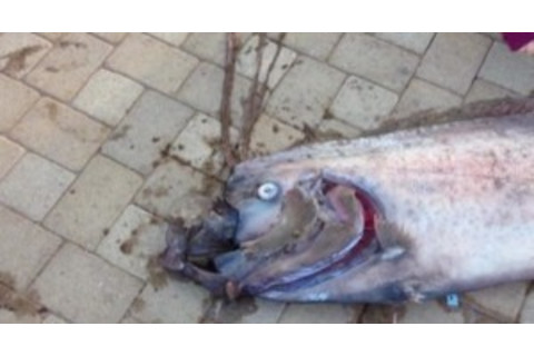 A face only a mother could love. Credit: Associated Press video screenshot Santana was paddling around in shallow water, about 15 to 20 feet deep, when she came upon the enormous fish. She got over her initial shock, realized what it was and, with the aid of being underwater, pulled it from the ocean floor to the surface. She then enlisted the help of more than a dozen CIMI staff to haul the nearly 400-pound creature onto the Catalina Island beach. There, scientists and spectators marveled at the monstrous eel-like fish. At 18 feet long, it’s one of the biggest ever reported. (Navy SEALs found a washed-up 23-footer in 1996.) According to the National Oceanic and Atmospheric Administration, oarfish can grow up to 50 feet, though verified findings have been only about half that size.