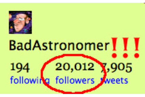 I made it! 20,000 Twitter followers! Thanks to everyone who joined up and/or decided they needed to hear even more of me, if only in 140 character form. I will endeavor to be even more banal and describe my breakfast more often. And of course -- as promised -- I have donated $200 to the James Randi Educational Foundation. If you want to join me and give money to this worthy organization (full disclosure: I'm the President, but it is a good cause) then go to the JREF donation page, or if you're on Twitter and have a PayPal account you can use Twitpay. Just sign up for the service (it only takes a couple of minutes) and send a Tweet that says @JREF twitpay $50 (you can add a note to the end like "because Phil made 20k tweeps") and the process will start up automatically. Thanks to everyone who followed and to those who donated. It's much appreciated, and you can know your money is going to help fight the forces of nonsense that are forever storming our gates.