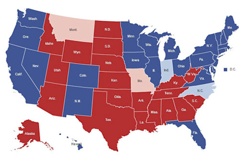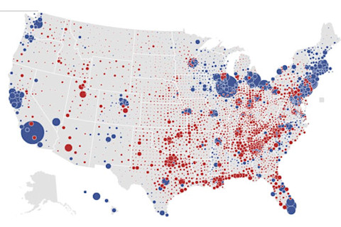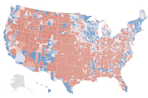 The New York Times put together a really nice interactive map for the election...but I thought it would be nice to have the three displays right next to each other instead of just toggling. So below the fold are the: 1) States as allocated to each candidate 2) Counties allocated to each candidate, shaded to illustrate the size of the percentage margin 3) Counties allocated to each candidate, with a bubble representation whose size is proportional to the absolute margin of the winning candidate in that county