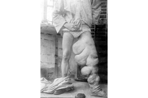An Indonesian man with elephantiasis caused by Wuchereria bancrofti. The worm resides in the lymphatic channels, usually in the lower extremities, where they interfere with the normal transport of lymphatic fluid and cause obstruction. Image: Tropenmuseum. Click for source.