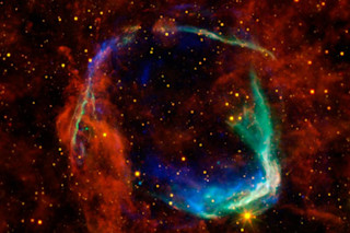 Above, combined X-ray images from NASA's Chandra X-ray Observatory and the European Space Agency's XMM-Newton Observatory show how a shockwave heated the interstellar gas to millions of degrees.