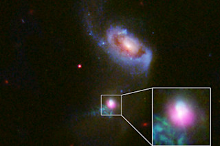 To the north of the black hole, astronomers saw a shock wave propagating through the gas from the black hole, already at a distance of 3,000 light-years from the black hole. This burp is from a second, more recent meal the black hole consumed. Between the two events, the black hole was likely much more dormant — expected behavior for such objects, which, according to Comerford, go through a cycle of snacking, burping, and napping, then snacking and burping again. An additional piece of the puzzle falls into place as one zooms out on the images of J1354 — the galaxy is located near a second, companion galaxy, which likely interacted with it in the past. The collision between the two galaxies then funneled material in toward the supermassive black hole and provided those large meals that prompted the burps.