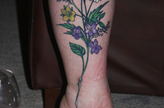 Julia writes, "6 years ago I decided to change my life and go back to uni to study medicine. I decided that if I got through I was going to get a tattoo to celebrate – I wanted a tattoo that said something about me – about where I'd come from. It took a long time to come up with the idea, but I came up with this – the neurone represents my medical degree, which synapses with my first academic passion - the biogeography of plants (so maybe I'm a bit of a freak). To tie these together further, I chose plants that have medical (or at least pseudo-medical) uses – the dog violets can supposedly improve renal function (I want to be a nephrologist – many people think that makes me even more of a freak), and chamomile is known to have a calming effect (I thought it might help with all those stressful on-calls!). Frankly, I chose the herb bennet because I thought it looked pretty! I'd originally planned on having the neurone the other (right) way round, but my fantastic tattoo artist, Charlotte (she owns Venus Fly Trap in Edinburgh), thought it would look more root-like this way round, so I sacrificed some scientific accuracy for the sake of aesthetics."