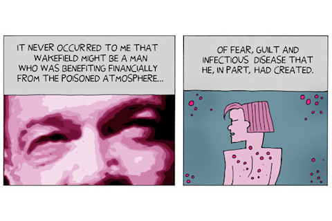 I've written about the misdeeds of Andrew Wakefield, the founder of the modern antivax movement, in the past -- the links in this post will give you an idea of this guy. But I'm smart enough to know that I can write until I'm blue in the face about him, and the poison antivaxxers spread will still be accepted by people. That's why I'm glad there are different ways of getting the truth out there. One of them is in the form of comics; somehow, adding art to the discussion makes it easier to understand, and easier to absorb.