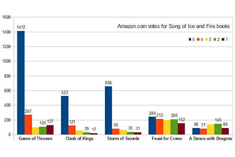 A 5 star rating is good. The sample size is not too large in relation to previous books, but I think we can conclude that this is more in keeping with the perception of relative mediocrity of book 4, than the epic virtuosity of the first three in the series. I have also now read A Dance with Dragons, and here are my impressions (no specific spoilers, though I'm going to talk about the general tenor).... I think the low score for A Dance with Dragons even compared to A Feast for Crows has less to do with the content and style of the book in relation to its predecessor than the reality that the readers of this series are even more hungry for some movement of the plot arcs. This makes sense. Many of the people who started with A Game of Thrones as virgins now have families! These are people with less time, and they want some bang for their buck. But that's not what they've been getting, at least since A Storm of Swords was published in 2000. Unfortunately for us this may all be part of the plan. A Dance with Dragons and A Feast for Crows are really two halves of the same book, with the narrative interleaved across them in terms of chronology. If you follow George R. R. Martin's explanations of how the series got out of hand in the early 2000s you know that this wasn't in the cards at inception. Rather, these books were planned as a bridge between two very different periods of the overall narrative, which was originally going to be more distinct because of a chronological gap between the earlier books and the later ones (this would allow some of the younger characters to mature at least into adolescence). But what was once a trilogy is now projected to have seven books in all, and many are placing bets that it will go beyond that. To some extent the story has gotten away from the author and these two books are attempts to pause, take stock, and reload. And because they are so instrumental in their role in the whole series they don't live and breath as ends unto themselves. It's clear when you're reading the earlier books that they're pieces of a broader puzzle, but even if you don't finish the puzzle, the Byzantine machinations of A Game of Thrones and the pathos of A Storm of Swords leave you with something which stands apart from the overall series. There is nothing like the "Red Wedding" in A Dance with Dragons or A Feast for Crows. You plod through them because you hope you're setting the foundations for the "good stuff." But this act is expending the capital of goodwill built up from the previous books. They just don't stand up on their own legs. Don't get me wrong. George R. R. Martin is not my bitch! This is fictional series. But it was a damn good one. In fact, I still think it's a damn good one. But if the author continues to construct the launching pad in book 6 I suspect he'll lose a lot of people. The proliferation of plot points and viewpoint characters boggles the mind, and in interviews Martin has indicated that sometimes he feels overwhelmed. With his zest for killing off characters he shouldn't have a problem making this issue go away, and there is a high likelihood that the canvas across which he's painting his plot will constrain the possibilities of his creativity soon enough. I'm hoping this is the calm before the storm (in a good way!). Addendum: To my surprise Robert Jordan's series didn't really flatten in the distribution of ratings until book 8.