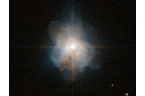 [Click to ennebulenate.] It looks like a flower, doesn't it? The petals you see are actually sculpted lobes of gas. I'm guessing it undergoes periodic episodes where it blows out gas in focused beams, which then move outward and form those features as they plow into gas previously blown out by the star. It's a guess, but it fits what's known about the inner regions of the cloud near the central star. There's a thick disk of material surrounding the central star, something like 30 billion km (20 billion miles) across, far larger than our solar system. Every six years or so, the central star appears to dim, which may be due to the inner part of the disk itself becoming unstable and puffing up, blocking the light. This disk may also be responsible for shaping the outflow of the gas from the star, forming those petals. If you're wondering just how much material the star is blowing out, it turns out to be about the mass of the Earth every year! That's a tiny fraction of the star's mass, but it blows out this much every year for thousands of years. Eventually that wind will turn off, and all that will be left is the very hot (30,000° C or about 55,000° F) core of the star, which will then cool over the next few billion years. Long before then the expanding gas around it will dissipate, and all that'll be left is a very diffuse cloud of material that will mix with the ethereally thin matter between the stars. Well that, plus images like this one. And, of course, the knowledge we've gained studying how stars die. Credit: ESA/Hubble & NASA