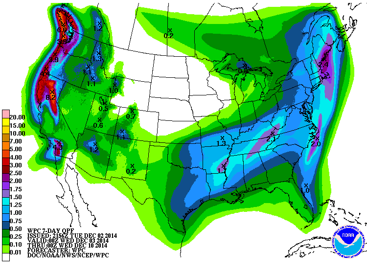 Seven-day forecast of precipitation totals, in inches. (Source: National Weather Service) Whether El Niño is declared or not, the map above is very good news for California and other parts of the West afflicted by drought. It depicts forecast precipitation totals over the next seven days. Check out that big stripe of orange over the northern Sierra Nevada mountains in California. The "X" marks the spot of a predicted 8 inches of precipitation. That should really help snowpack. Let's hope this forecast comes true — and that the precipitation keeps coming, regardless of whether El Niño finally is born.