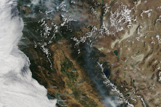 Satellite view of California and Oregon on July 23, 2018. Smoke from the Ferguson Fire near Yosemite National Park is visible in the lower right quadrant. Another sprawling smoke pall can be seen in southern Oregon at upper left. (Click to open the image and then click again to zoom in. Source: NASA Worldview) You may have heard about California's Ferguson Fire, which has killed one firefighter and is threatening to spread into Yosemite National Park. But a series of other fires, sparked by lighting to the north, are also raging. And now, thousands of firefighters struggling to contain the blazes must contend with a heat wave descending on the region. In the image above, acquired today (Monday, July 23) by NASA's Terra satellite, look for a thick pall of smoke in the lower right quadrant. This is the Ferguson Fire. Another sprawling area of smoke is seen in the upper left quadrant. This is from the fires in southern Oregon. The smoke can be distinguished from wispy white clouds by it's grayish and, in some places, bluish cast. Here's a closer view of the Oregon fires:
