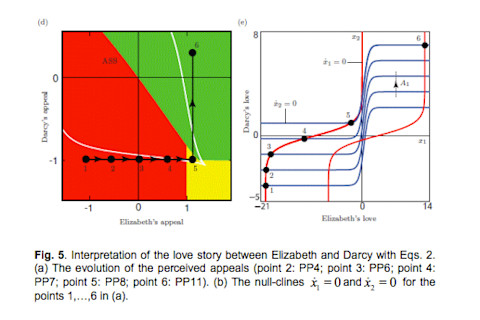 Do you like math? Are you a fan of "Pride and Prejudice"? Then have we got the paper for you! Here, the authors propose a set of differential equations that describe the romance between Elizabeth and Darcy. Apparently, the mathematical model of their love story is characterized by a "saddle-node bifurcation"; according to the authors, "A series of small discoveries can give rise to a sudden turning-point in the development of a love story. In mathematical terms these turning-points are nothing but so-called catastrophes, which, in the case of Pride and Prejudice, are technically revealed by the existence of a saddle-node bifurcation." For more details on the model, check out the figure and text below. We just wonder if there is a mathematical model that explains why Colin Firth is the best Darcy?A mathematical model of 'pride and prejudice'. "A mathematical model is proposed for interpreting the love story between Elizabeth and Darcy portrayed by Jane Austen in the popular novel Pride and Prejudice. The analysis shows that the story is characterized by a sudden explosion of sentimental involvements, revealed by the existence of a saddle-node bifurcation in the model. The paper is interesting not only because it deals for the first time with catastrophic bifurcations in romantic relation-ships, but also because it enriches the list of examples in which love stories are described through ordinary differential equations." Bonus figure and excerpt from the main text: