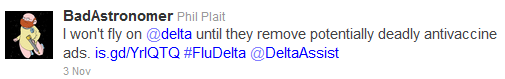 A couple of antivax stories hit the web in the past day or so, and both have me pretty angry, shaking my head about how people can manage to get things so wrong. First, the antivax organization that is (Orwellianly) called the National Vaccine Information Center has paid for ads to run on in-flight Delta airline TVs. These ads give what can charitably be called misleading information about vaccines. Skepchick has the details, as does Harpocrates Speaks. NVIC is an organization that is resolutely antivaccination, despite the overwhelming evidence that vaccines are one of the greatest medical science triumphs of all time, having saved hundreds of millions of lives. NVIC, on the other hand, is a group that likes to try to sue critics into silence while at the same time spouting statements so ridiculous they make my irony gland fear for its life. I decided to make a short and simple tweet about the ads being run on Delta airlines: