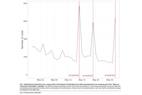 A remarkable paper just published in PLoS ONE reports on what is, I think, one of the largest psychological experiments of all time. Researchers Elizabeth L. Paluck and colleagues partnered with a TV network to insert certain themes (or messages) into popular dramas shown on US TV. They then looked to see whether these themes had an effect on real world behavior, ranging from Google searches to drink-driving arrests. The study was based on three prime time Spanish-language dramas (telenovelas) which have a viewership of around 1.2 million people per week. Telenovelas are a genre similar to English-language soap operas except shorter, most lasting about a year. Into these shows, eight messages were added, ranging from health and safety (benefits of low cholesterol, dangers of drink driving) to community building (register to vote, scholarships for Hispanic students.) In total, there were 23 scenes, featuring 16 minutes and 51 seconds of footage. The scenes were "not central to the shows’ plots" but "many involved the shows’ main characters." What makes this a genuine experiment (rather than just an observational study) is that the researchers used randomization to determine when in the season to broadcast each message. So did it work? Not really. The airing of scenes featuring the Hispanic Scholarship Fund did lead to large (but temporary) spikes in the number of people visiting that organization's website.