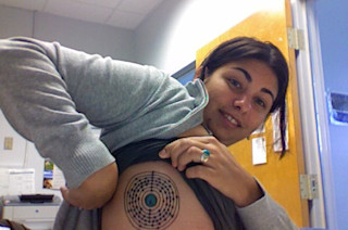 Denise writes, "I just finished my Ph.D. on microbially-mediated uranium bioremediation and chose to get a new tattoo to commemorate this milestone. The tattoo is a uranium atom with each orbital and all 92 electrons represented. The center is blue with a swirl to represent the ocean where I grew up."