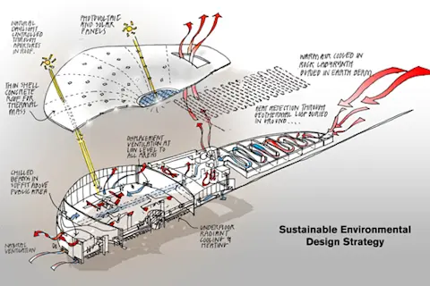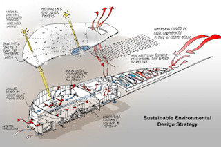 Starting in 2009, tourists with deep pockets will be able to enjoy something fewer than 500 people have been lucky enough to experience—spaceflight. For $200,000, if all goes well, they can orbit for two and a half hours in Virgin Galactic’s SpaceShipTwo. But the port for landing and takeoff—Spaceport America in New Mexico—will also be sensitive to the needs of those stuck on Earth. The plans, revealed in September, show a teardrop-shaped building with high-tech ventilation systems, solar panels, and massive windows, all features that could earn it top certification for efficiency and energy savings by the U.S. Green Building Council. The port’s designer, Norman Foster, founder of Foster + Partners, says it will be “an ecologically sound model for future Spaceports.” For a place that may launch two rockets out of the atmosphere each day, will solar panels and natural light really make a difference in its environmental impact? What amount of carbon emissions are involved in space travel anyway?