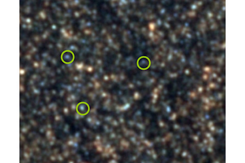 I know, they don't look like much, do they? But you have to realize what you're seeing here: those circled blobs of light are entire galaxies, with billions of stars, and they're a staggering 11 billion light years away. That's really, really far. The Universe is only 13.7 billion years old, so we're seeing these galaxies as they were just a few billion years after the entire Universe came into being. Not only that, but the amount of infrared light these galaxies are emitting is truly terrifying: in the infrared alone, they are blasting out a solid trillion times the Sun's entire energy output. A trillion! 1,000,000,000,000! That's a whole lot of energy. And it comes from a whole lot of newborn stars, because these galaxies are cranking out stars at a rate 700 times that of our own Milky Way galaxy! The view inside those galaxies must be breathtaking; imagine being surrounded by the Orion Nebula everywhere you look. Wow.