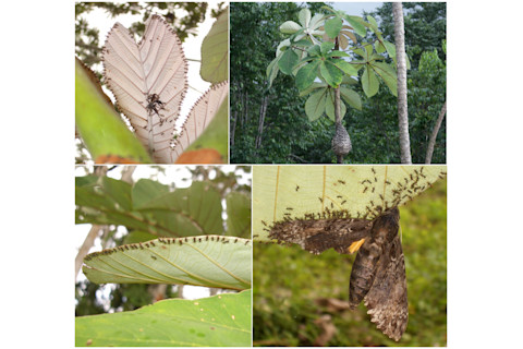 To test the workers’ strength, Dejean dangled threads with weights at the end of them in front of their open jaws. He found that each worker can hold onto 8 grams, around 5,700 times her own weight. As a unit, they can manage far more. The workers also seemed to be particularly strong on the downy underside of the leaves than on the rough upper surface, or on a sheet of smooth plastic. And they were especially mighty on their host plant. When Dejean tested them on a closely related tree with a less downy underside they couldn’t hold onto as much weight. The downy underside is the key – it provides something for the ants’ claws to fasten onto. These ants are one of the many hundreds of ant species that form lasting relationships with plants, defending them from plant-eaters in exchange for shelter and food. But all of them have a problem. Plant nectar is typically poor in proteins and nitrogen, and while some plants pay their bodyguards with special protein-rich food packages, most plant-defending ants must get these nutrients in other ways. Some rely on thriftiness, by producing workers with very thin shells and venoms that don’t contain any protein. Some rely on bacteria and others farm sap-sucking bugs that they gently nip from time to time. And yet others solve the problem by hunting for fresh meat. Foraging in the forest canopy is difficult so these tree-top predators rely on ambush techniques that make the most of prey that approaches them. Azteca andreae’s strategy of lying in wait is just one such technique. A related species Azteca bequaerti hides in special hollows produced by their host where it listens for the vibrations of a landing insect and swarms it en masse. Even more elaborately, Allomerus decemarticulatus creates elaborate traps by building layers over tree branches that look like parts of the tree but are actually hiding places for ant ambushers. The layers are made out of the hairs of its host tree bound together with a fungus that the ants farm. They are pitted with tiny holes that the ants hide in. When a victim lands, the ants launch a grisly surprise attack, rushing out from their holes and grabbing the victim by the legs. As with A.andreae, the victims of A.decemarticulatus are stretched out and eaten. In the rainforest, even a harmless looking leaf or branch can hide a painful death inside or beneath it. Reference: PLoS ONE http://dx.doi.org/10.1371/journal.pone.0011331More on ants: