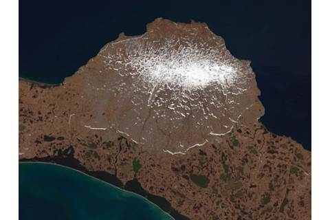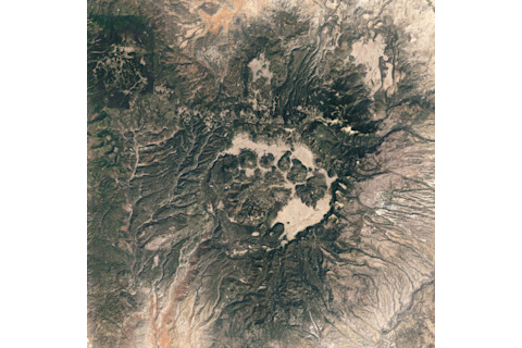 The snow-covered Kookooligit Mountains on St. Lawrence Island in Alaska. Seen by Landsat 8 on June 17, 2015. USGS-NASA (processed by Rob Simmon) If you think the Wrangell-St. Elias range is remote, then Kookooligit Mountains will change your mind. On St. Lawrence in the Bering Strait, the Kookooligit Mountains are actually a large shield volcano with over 100 smaller cinder cones on its surface. Think of it like the Alaskan equivalent of a place like Mauna Loa or Piton de la Fournaise ... except that it likely wasn't formed due to a hotspot like those volcanoes. No one is quite sure why there are volcanoes in this stretch of the Bering Strait (one possibility is reactivation of strike-slip faults), but the Kookooligit Mountains are far from extinct. The last dated eruption in the last 25,000 years but many of the features on the volcano look much younger than that. Diamond Craters, Oregon