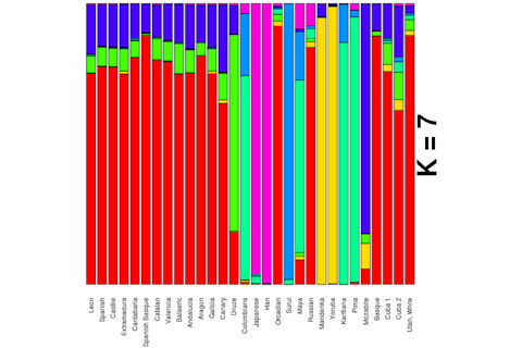 This is a fair point. I switched computers recently, and the Behar et al. data set I had seems to have become corrupted. So I snatched the Mozabites from the HGDP, and removed the Gujaratis from the previous run. I also added Russians, Druze, and some extra Amerindian groups. At K = 7 this pattern jumped out: