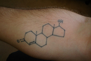 Attached is my tattoo of the 17β-hydroxyandrost-4-en-3-one molecule a.k.a testosterone. I got it a couple of years ago after many years of thinking about getting it. I have a degree in biotechnology and am currently undertaking honours in molecular biology. I am studying the effects of glucocorticoids on fetal lung development.The tat has to do with my love of lifting heavy weights and the most important molecule for that is testosterone. People can take all the synthetic testosterones and steroid derivatives they want but nothing feels better than knowing after a heavy lift that all you used was that which your testes produced. I also like to look at it and draw inspiration or just contemplate. I contemplate on what it is to be a man and what it means to be masculine and that it's about strength of character and not just being strong. The best thing about it is that it's unique and brings a smile when I tell people what it is - crazy scientists!