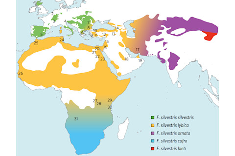 (Credit Wikimedia Commons/Helgi Halldórsson) Both the archaeological and paleogenetic record show that dogs are unique in being the only animal domesticated prior to the advent of agriculture — so while cat and dog fanciers will forever disagree on whether Canis lupus familiaris is indeed man's best friend, science has shown us that it is at least man's first friend. With an ongoing, multidisciplinary research project to pin down the origins of dogs, scientists are developing a fairly detailed picture of Fido's roots. But despite millions of us living in close quarters with cats, much of their backstory is unknown. Archaeologists have found some remains — the cat mummies of ancient Egypt are the most famous, though a much older complete cat skeleton was buried beside a human at a site in Cyprus that dates back to about 7,500 B.C. But researchers don't have enough to be certain about where and when cat domestication occurred. (We're already pretty sure about the how of cat domestication...most researchers believe that, as Neolithic humans began to farm, they started storing grain, which attracted rodents. Wildcats, already dispersed across Africa, Europe and Asia, were attracted to grain-munching prey. In a kind of symbiosis called commensalism, humans tolerated the cats being around because the vermin hunters kept the grain pest-free. Over time, humans developed a more personal relationship with their local ratkillers. A 2013 study of 5,300-year-old cat remains from China, for example, found evidence that the animals were being cared for.) Old Thinking Shredded Published today in Nature Ecology & Evolution, researchers obtained genetic material from nearly 400 cats living and very dead. More than 350 ancient cat samples were collected, including from remains up to 9,000 years old. Unfortunately, but not surprisingly, they were only able to obtain usable sequences of ancient DNA (aDNA) — in this case, maternally-inherited mitochondrial DNA — from 209 of the samples. That's the thing about aDNA: the older it gets, the more degraded and tougher to work with it is. The team also extracted the DNA of a couple dozen modern wildcats from Bulgaria and East Africa. Why wildcats? Well, today's house cats are descended from Felis silvestris lybica, the only one of the five subspecies of F. silvestris ever domesticated (as far as we know). F. s. lybica is today dispersed across the northern half of Africa and southwest Asia, while F. s. silvestris is the subspecies found in Europe. Having DNA from these populations helps researchers compare domesticated cats with a broader range of wild distant relatives, leading to more refined datasets.