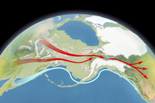 Arrows show the flow of human migration across the Bering land bridge from Asia. | Gary Hincks/Science Source