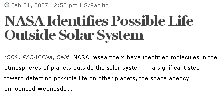 This is in reference to the announcement yesterday that astronomers have been able to identify molecules in the atmospheres of two planets orbiting other stars. This is an important step in being able to find organic molecules in other planets, but is hardly "possible life"! There is no attribution to the article, so I don't know who wrote it. In general, the headline is written by an editor and not the article author. The article is attributed to the Associated Press and no doubt the headline was written buy a web editor at CBS.