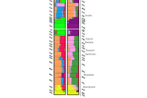 There's a new paper in AJHG out, Whole-Genome Genetic Diversity in a Sample of Australians with Deep Aboriginal Ancestry, which I'll hit later. It doesn't have anything too surprising, but in the supplements they have a figure which shows frappe and Structure plots for the HGDP populations as well as their Australian Aboriginal sample. These methods take an individual's genome and assign elements to one of K ancestral populations. For African Americans this is highly illuminating, as K = 2 simply breaks down along European/African ancestral lines. The mean turns out to be ~20% for the minority quantum, exactly what had previously been ascertained through genealogy, classical autosomal markers (e.g., Duffy), and the average of uniparental lineages for European ancestry (African Americans tend to be enriched for European Y chromosomal markers, and have less than the expected European mtDNA markers. Again, totally intelligible in light of the history of relations in the old South). These abstractions extract visually intelligible information out of the hundreds of thousands of concrete variant bases within human populations. They have clear and immediate utility when you have some inkling of the population history of a given sample. But when you attempt the same with populations whose histories are less clear and distinct, or who do not have such an obvious and well known genesis as African Americans, then things get murkier. Therefore when it comes to higher values of K in many of these papers I just avoid reading too much into the results because the human mind is a pattern recognition machine, and it's very easy to tell stories which have no way of being validated or falsified. Most of the authors of these papers tend to agree as higher K plots are usually nested in the supplements, not the main paper itself. But with all that caution entered into the record, I thought that K = 8 in the supplemental figure 1 was of some interest, and I want to focus on it just a little bit. I reedited it, removing many populations, and shifting the frappe and Structure plots at K = 8 next to each other. I also added some population labels for clarity, though if you're familiar with the HGDP data set it's clear what the abbreviations are.