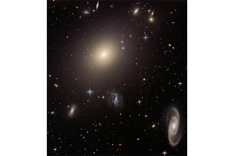 What you're looking at is galaxy cluster Abell S0740. If galaxies are island universes, then clusters are archipelagos. Some are small, like this one, but others have hundreds or thousands of galaxies in them. In many of them, there is a central elliptical galaxy which dominates the cluster, and this cluster is no exception. The central galaxy grows through cannibalism, eating other galaxies and assimilating them. Sometimes the evidence for this is that the central galaxy has multiple cores -- think of them as the undigested remains of its conquests -- and sometimes the galaxy gets "puffed up" as the energy of the consumption is transferred to the stars in the galaxy. The central galaxy in this image has the look of the latter to me, but I'm not an expert. By the way, most of the little pinpricks of light you see surrounding the central galaxy are globular clusters. Cool. The other galaxies in this cluster are a mess. This is expected. Imagine taking a hive of bees and compressing it. As the bees get jammed together, they get disturbed, right? Well, the same thing, kinda, is happening here. When you jam a few dozen galaxies into a small volume, their gravity starts to make a hash of things. They pass close by each other, disturbing their shapes. You get outright collisions as well.