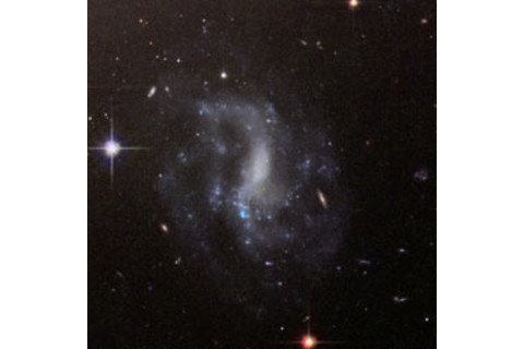 That spiral above doesn't look too happy to me. I think a few passing galaxies have distorted its shape. You can see blue regions in it as well, which are locations of star formation. This can get triggered when passing galaxies gravitationally poke gas clouds in a neighboring galaxy, slamming them together, which in turn makes them collapse and form stars. Now look at this one: