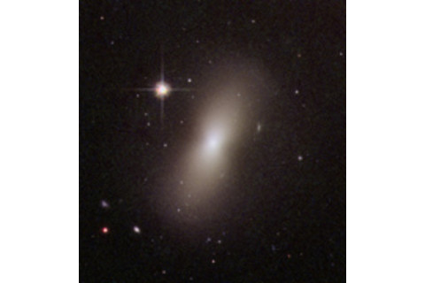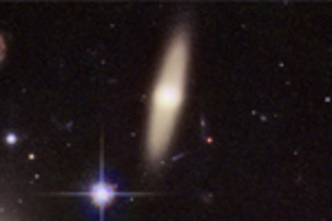 This is what's called a polar ring galaxy. If a small galaxy ploughs right through the center of a bigger galaxy, the bigger one can form a massive ring of stars surrounding a cylindrical mass in the center, like an axle on a wheel. We're seeing this one nearly edge-on, and it looks a lot like a normal spiral galaxy seen edge-on. But if you look carefully, along the disk you can see a dark gap, which indicates this is really not a disk seen edge on, but a ring. Then there's this thing: