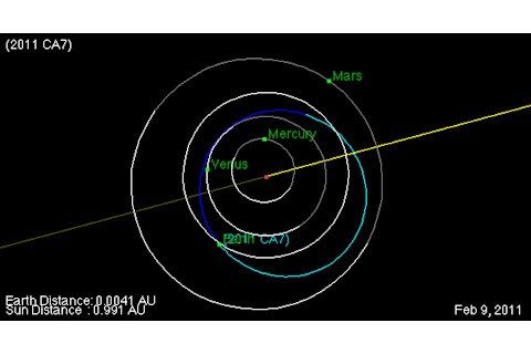 On February 9 at around 19:30 UT, a small asteroid the size of a car will cruise past the Earth, missing us by a distance of about 100,000 km (60,000 miles). By astronomical standards that's pretty close (about a quarter of the way to the Moon) but it'll miss us for sure. Called 2011 CA7, it was discovered earlier this month. The short notice is not too surprising, given that it's at a very faint magnitude of 20 -- you'd need a big telescope to be able to see it at all! Even at closest approach it'll be magnitude 17, less than a ten-thousandth as bright as the faintest star you can see with your unaided eye. There is some small uncertainty by exactly how much it'll miss us; the orbit isn't precisely determined yet. According to the JPL small-body data browser, the minimum distance 2011 CA7 will pass us is 93,000 km (58,000 miles), and the maximum is 114,000 km (71,000 miles), but the most likely distance is 103,000 km (64,000 miles). These numbers may change as time goes on, but the important thing to note is that