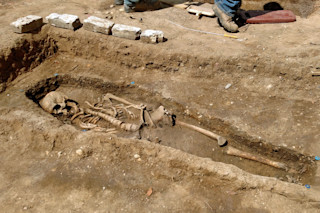 Bones unearthed at the gravesite discovered in Milwaukee. Credit: Elisa Neckar, Discover In 1874, Milwaukee was swelling with immigrants. The city’s population had more than septupled in less than thirty years, and German immigrants to the area had established the largest concentration of a single ethnic group anywhere in America. In response to this exponential growth, the Common Council decided that 13^th Street would have to be expanded – and the new street would have to run through the German Protestant Cemetery in the city’s Second Ward. The Common Council ordered the cemetery owners to relocate the bodies within 30 days. Since I’m standing in a partially excavated lot in the middle of downtown Milwaukee in August of 2015, with 13^th Street to my back and gravesites all around me, it’s pretty obvious that relocation never happened. The graves were uncovered during construction for an addition to the Guest House homeless shelter, which occupies the lot to the south of the cemetery site. In June of 2014, construction of a rainwater-harvesting pavilion for the shelter’s urban garden just across 13^th Street uncovered two burials. Based on those finds and information from the Wisconsin Historical Society that an unmarked cemetery may be in the vicinity, and in accordance with Wisconsin statutes, the Guest House had an archeological monitor on site when construction began, in case any further burials were uncovered. “I think it took all of 20 minutes,” Dr. Patricia Richards says wryly. Richards is the associate director of the University of Wisconsin-Milwaukee’s Cultural Resource Management (UWM-CRM) program, the contractual branch of the university’s Department of Anthropology, which helps clients maintain compliance with the state’s archeological standards and provides interpretation services. And she’s seen plenty of “relocated” cemeteries resurface before. “In my career as an urban archeologist, if I had a dollar for every time remains were supposed to be moved and they weren’t,” she says, her voice trailing off meaningfully. Often, only headstones were relocated; following through with transferring the bodies themselves was dependent on whether there was family in the area to “steward the remains.” If an immigrant had come to America alone, or if his or her family had moved out of the area or died themselves, chances were no one would make sure gravesites were tended. Or, when necessary, dug up and moved. In this case, the director of the Guest House was hopeful that the graves had been relocated, since she knew late-19^th century housing had stood on the lot. In fact, Richards points out where the foundation of a rather shallow basement had to be removed in advance of her team’s excavation. But, she says, when they lifted it out, clear stains from the disintegrating wood coffins marked the bottom of the cement – the 19^th century homebuilders must’ve known exactly what they were building on top of.