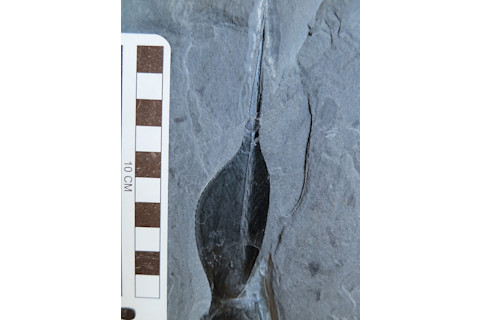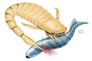 Sea scorpion Slimonia acuminata made fast work of its prey with a saber-like spine. (Credit Nathan E. Rogers) Be glad our species wasn't around some 400 million years ago...we would have had to contend with giant sea scorpions, some more than 10 feet in length and capable of prowling about on land in search of a meal. And that's not all: Researchers reveal that at least one of these Monsters of Deep Time had a particularly violent — and unusual — way of dispatching its prey. Published today in The American Naturalist, the spine-tingling tale of a stabby sea scorpion is straight out of an old-school monster movie. Or a monster pirate movie. Scott Persons, a University of Alberta paleontologist, describes the sea scorpion Slimonia acuminata as nothing less than a "primordial swashbuckler of the high seas." (One reason I always love hearing from Scott: He hasn't lost his delight in science, which can seem pretty scarce these days.) Persons and co-author John Acorn, also at U of A, believe the animal used a serrated spine to stab and slash its prey. Nasty way to go. The Story Behind The Stab The researchers took a fresh look at a 430 million-year-old specimen of S. acuminata from Scotland's Silurian period. Though the animal is known from other specimens, this particular one had a gorgeously preserved back half, including its telson, the final segment in the arthropod's body. Its telson is both pointy and serrated: the Ginsu II of the Silurian. But what's even more interesting about this particular specimen, MB.A 863, is that its back half is strongly curved to the left. Why is that a big deal? Well, because sea scorpions in general moved through water differently than the distant relatives you may be more familiar with, such as today's lobster. Crustaceans tend to have a lot of up-down flexibility in their back half, which they use for both forward and backward movement. The sea scorpions (more accurately known as eurypterids), don't have that same up-down swishiness. It's thought that they used their paddle-like appendages to get around in water.