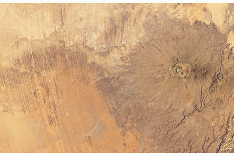 [Click to dicraternate.] Obviously, that's a volcano on the right: Emi Koussi, in northern Africa. But look to the left, almost at the edge of the picture. See that faded ring? That's Aorounga -- an impact crater, some 10 - 15 km wide, formed when a chunk of cosmic debris hit the Earth about 300 million years ago! So these are two craters, one formed from processes happening deep below the Earth, and one from events from far above. Yet both can be seen at the same time, from one vantage point: orbiting our planet somewhere above the surface but beneath the rest of the Universe. Image credit: NASA