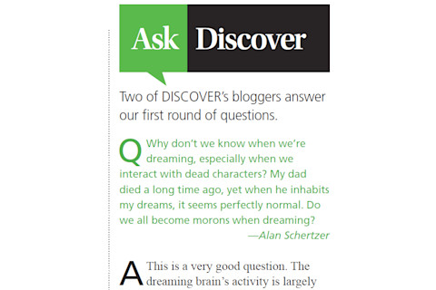 The print version of Discover Magazine has a new feature called Ask Discover, where readers’ questions are answered by one of the bloggers. In the current issue, Alan Schertzer asked: