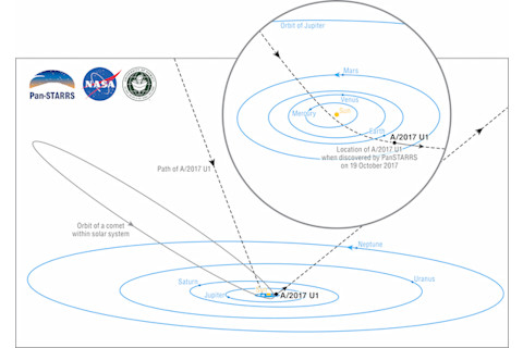 Animation showing the path of A/2017 U1 through the solar system. (Credit: NASA/JPL) Astronomers have spotted an interstellar visitor for the first time. It's either a comet or an asteroid, and came speeding right through the heart of our solar system; after a hairpin turn around the sun, it's now on its way back out of our cosmic backyard. Scientists at the University of Hawaii's Pan-STARRS 1 telescope at Haleakala first spotted the quarter-mile-wide object on Oct. 19, and knew immediately that it was something different. "Its motion could not be explained using either a normal solar system asteroid or comet orbit," says Rob Weryk, a postdoctoral researcher at the University of Hawaii. "This object came from outside our solar system." The object, named A/2017 U1 for now, is moving in a path much too eccentric to be a comet or asteroid from inside the solar system. It shot into our home system from above, at a far higher angle than any other objects orbiting the sun. It's going fast, too, around 15.8 miles per second, another clue that it comes from far away. It's the first time astronomers have managed to confirm an interstellar object in our solar system, although they've long suspected that comets and asteroids must be flying free throughout the universe.