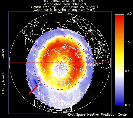 I just got word from the NOAA Space Weather Prediction Center that Saturday's solar activity blew a wave of subatomic particles from the Sun that is reaching the Earth now. They rated this as a strong G3 event, which means it's not dangerous per se but should spark aurorae at high latitudes. If you live at very north or very south (like southern Argentina, Australia, and so on) latitudes, you should get out after dark and take a look. You can also check the SWPC's aurora map to check your odds of seeing anything. Here's the map for the northern hemisphere as of today at 21:00 UT (5:00 p.m. Eastern US time):