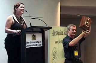 Meryl Dorey -- the truth-impaired mouthpiece of the Australian Vaccination Network, a group of antivaccination conspiracy-mongers who couldn't find reality with both hands, a compass, and detailed instructions -- was "honored" by the Australian Skeptics this week. Richard Saunders and Rachel Dunlop (pictured), on behalf of the AS, gave Dorey their annual Bent Spoon award, awarded to "the perpetrator of the most preposterous piece of paranormal or pseudo-scientific piffle". Dorey certainly fits that bill! She hasn't met a conspiracy theory she hasn't loved, or couldn't use to threaten the public health with: