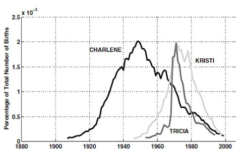 Charlene, for example, became slowly more popular from the turn of the 20^th century, peaked in 1950 and declined slowly after. Tricia and Kristi experienced faster rises in the 50s and 60s and fell equally sharply in the 70s and 80s. At their peaks, all three names accounted for around one in every 500 female births in the US, but Charlene had a much larger impact over time because of the slower pace of its change.