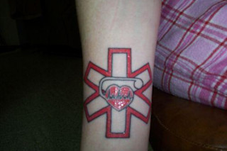 "I was born with a decent size hole in my heart and my parents were told that it would eventually go away with time. It didn't, and progressed into irregular beating and cardiac arhythmia. Finally, when I was 18, my doctor noticed that the sound of my heart had changed and that she didn't think it was functioning the way it should be. I went to a specialist and he determined that the AV node was blocked and that my heart was only beating half of what it should be. I got a pacemaker on December 23, 2003 when I was just 18. A couple years later, as a Christmas gift, my fiance paid for me to get the medical symbol for the pacemaker tattooed on my upper right wrist."