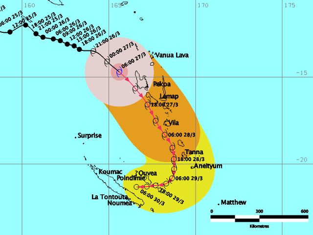 In this context, Vanuatu may get a test with cyclone Becky, whose projected path is shown above (courtesy of the RMSC-Nadi Tropical Cyclone Warning Center). So far Becky is just a Category 1 hurricane offshore, but it's expected to steadily intensify as it rakes Vanuatu's islands. That can't be good...