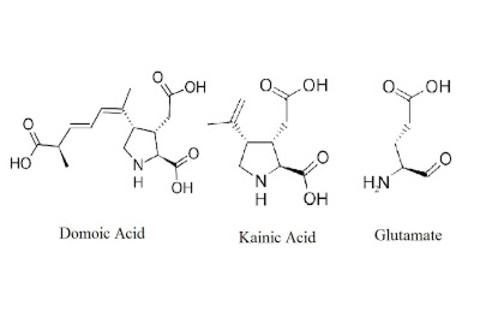 Domoic acid is related to kainic acid, which neuroscientists will have heard of: it's widely used in epilepsy research to give animals seizures, amongst other things. Both are excitotoxins - they kill neurons by over-activating them, which opens ion channels allowing calcium to enter the cell and reach toxic levels. They're able to do this because of their chemical similarity to glutamate, the brain's most common neurotransmitter (and the one that the drug ketamine antagonizes).