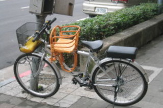 Seeing all the folders (see earlier post) rekindled my hope that all is not lost for the bike in Taiwan. You look a bit closer and they are there...just hiding. And occasionally you see a lot of fun innovations that are uncommon (at least in the USA). Three of my favourites can be seen in the following pictures. The first (above left) shows a sort of woven/wicker child seat that has been added on. That's fun. Notice also the back wheel fender has been replaced by a flat thing that looks like a back seat.