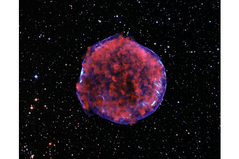 Pretty freaky, eh? [Click to ensupernovenate.] The science involved is pretty interesting (see the Chandra page about it), but basically, this shows high-energy X-rays (in blue) and lower energy X-rays (in red) emitted by extremely hot gas in the supernova (the entire image is superposed on the correct background from the Digitized Sky Survey to show the positions of stars). This emission traces the magnetic fields in the gas (which is actually ionized and therefore a plasma), and this in turn has yielded some surprises for the scientists. Again read the page for the details, which are cool. But in the meantime, the image itself gives an almost three-dimensional feel to the supernova remnant, doesn't it? The roiling gas is expanding away from the blast site at thousands of kilometers per second, driven by the explosion that, when it blew, was the equivalent of more than the energy given off by the Sun over its entire lifetime! And the shape is almost biological, too. It looks a lot like a cell seen under a microscope... though as we know, biological appearances can be very deceiving. Image credits: X-ray: NASA/CXC/Rutgers/K.Eriksen et al.; Optical: DSS