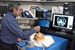 A monitor attached to the model shows the resident simulated X-ray images of the mock patient’s head in real time, as is the case in actual surgery. Computerized instruments also track and record the neurosurgeon-in-training’s every move so faculty can pinpoint exactly when and where something goes wrong.