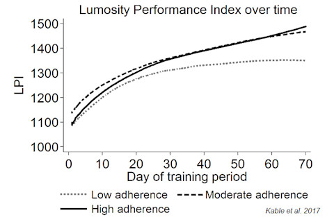 Lumosity "brain training" games have no beneficial effects on cognition, according to a paper just published in the Journal of Neuroscience. According to the authors, led by UPenn psychologist Joseph W. Kable, Lumosity "appears to have no benefits in healthy young adults above those of standard video games." In the study, 128 young adults were randomly assigned to either 10 weeks of Lumosity training, or a control condition: 10 weeks of playing normal, non-brain-based online videogames. The Lumosity group got much better at the Lumosity tasks over time, as shown by the Lumosity Performance Index: