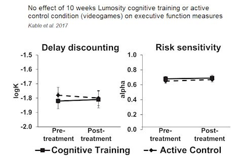 However, neither Lumosity nor the control had any effect on the key outcome: executive function. Executive function refers to cognitive processes that regulate behaviour and help make reasoned (as opposed to impulsive) decisions. Kable et al. measured executive function with two decision-making tasks called delay discounting and risk sensitivity. Neither group improved on either task: