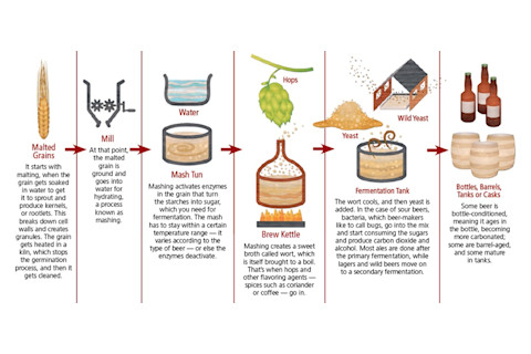 The general ingredients are water, hops, a grain and yeast. The grain is soaked in water to sprout, then heated and dried to stop germination and isolate its enzymes. This is malting. The malted grain is ground and steeped in hot water to activate enzymes that turn starches into sugar. This is mashing. The broth it creates is called wort, which gets drained and brought to a boil, then hops and other flavors are added. The wort cools, then yeast is added to consume the sugars and release carbon dioxide and alcohol. After this primary fermentation, ales are essentially done, but lagers and wild brews undergo a secondary fermentation and aging — “lagering” — some in tanks, some in barrels and others in bottles. How a brewer approaches each ingredient and step in the process determines the final product.