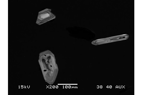 Lassen Peak in California, seen in October 2008. Image: Erik Klemetti So, I'm off to the American Geophysical Union Fall Meeting in San Francisco meeting tomorrow. This year, I will be presenting on my continuing research in the Lassen Volcanic Center (LVC) in northern California -- in fact, this is the first time I'll talk about some of my and my students' findings looking at the lavas and pumice from some of the more recent eruptions in the LVC. If you're interested, you can check out the abstract for my talk by visiting the Fall Meeting Scientific Program (sorry, no direct links, apparently) and searching for my name under "Fall Meeting Program". If you're at the meeting, you can come see me lead off the session (and the meeting) at 8:00 AM on Monday (December 9) in Moscone South 308. However, if you're not going to AGU, I thought it would be interesting to talk about why this research at Lassen is so fascinating. For those of you unfamiliar with the Lassen Volcanic Center, its most famous member is Lassen Peak. Now, Lassen Peak has had the most recent Cascade eruption that wasn't from Mount St. Helens, starting up in 1914 but peaking in 1915 and finally endings around 1917. The eruption was small, only 0.007 cubic kilometers of erupted dacite lava and tephra, but an eruption is an eruption in a range as quiet as the Cascades. However, go back ~1,100 years and the LVC was host to the eruption of Chaos Crags, a series of rhyodacite lava domes and associated volcanic deposits that totaled over 1.1 cubic kilometers of material. Go back even further, back 27,000 years and we reach one of the eruptions that built the main Lassen Peak edifice -- one that produced over 2 cubic kilometers of dacite lava and tephra. These are the three most recent silicic eruptions from the LVC -- that is, the ones erupting magmas with the most silica in their structure (we'll get back to why this is important). The LVC has also had a more mafic (lava with less silica) eruption, the 1666 eruption of Cinder Cone, but that is a story for another day. One great thing about silicic magmas, like dacite, rhyodacite and rhyolite, is that they can host zircon crystals (see below). That is what we've been examining for the past few years, these tiny but incredibly useful minerals. They are chock full of uranium and thorium (relatively speaking compared to other minerals) and also host many other trace elements (like hafnium, europium, ytterbium and more) that can tell us about the changing composition of the magmas in which they crystallized. The high concentrations of uranium and thorium allow us to date the crystals, or even individual parts of the crystals, and then match that age with compositional information from that same crystal. Thus, you can start to read back the compositional history that a zircon or a population of zircon has experienced. In my mind, that is incredibly fascinating because what these zircon do is record many of the events that happen in the subvolcanic magmatic system that occur between eruptions.