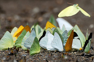 Butterflies prefer drinking urine from mountain lions over that of cows or humans—though scientists aren't quite sure why. Photo Credit:Geoff Gallice The sight of dozens of butterflies congregated in one spot might be beautiful, but if you know what they're actually doing, you might not want to get too close. When butterflies get together like this, it's usually to slurp up some nutritional goodies from an unexpected source—like, oh I don't know, animal pee. This behavior is often called "puddling" or "mudding", though the insects don't just suck on damp earth. To get missing nutrients like sodium which aren't common in the nectars they usually drink, they'll sip up turtle tears, fecal fluids, and even the juices from rotting corpses. So they're certainly not above a nice little pee puddle if it contains what they're looking for—and it does. There's sodium in basically all urine because it's used to draw the fluid from the body, though the amount varies.
